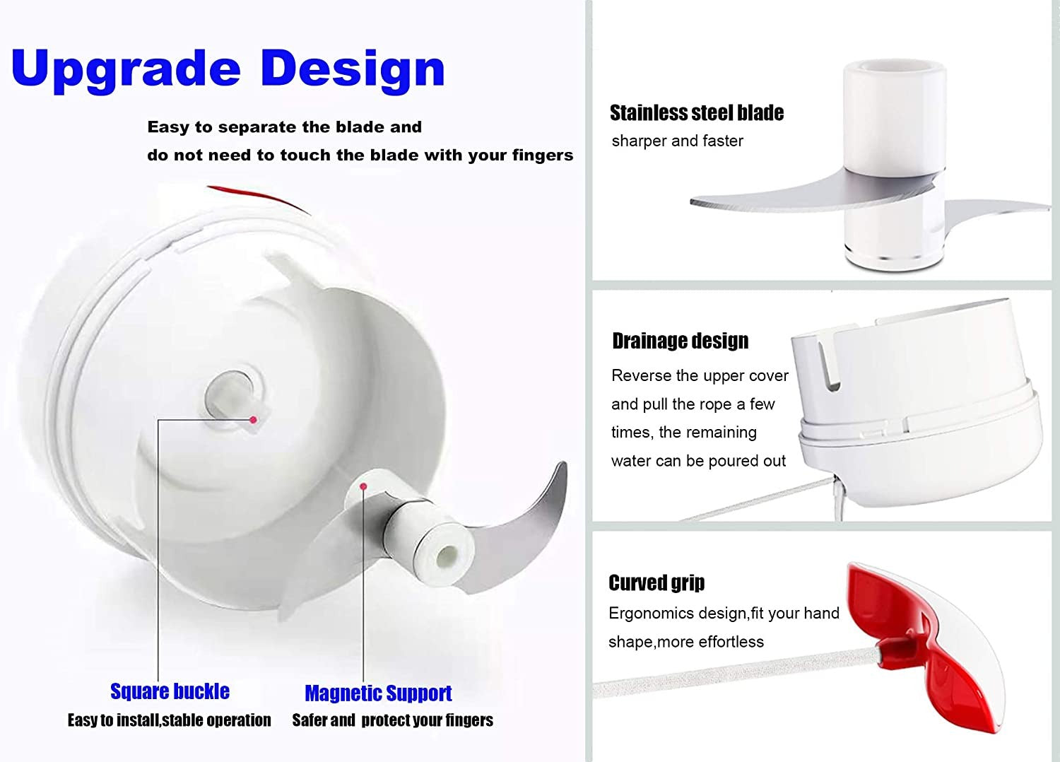 The blade is extremely sharp: The blades of garlic chopper are made from 434 stainless steel and will not bend or rust. The three blades are arranged in different directions and heights to ensure that all the ingredients can be chop evenly